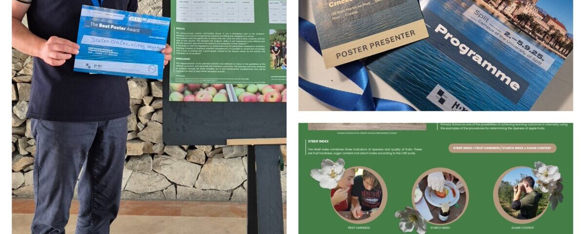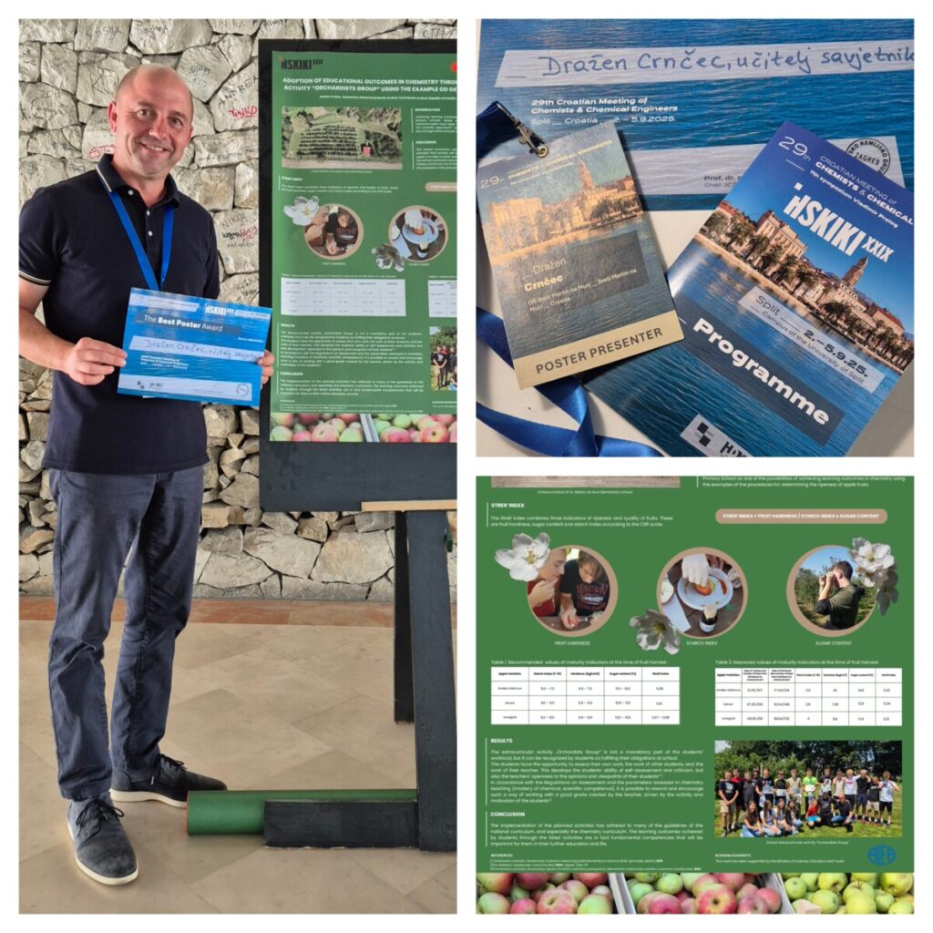 Od 2. do 5. rujna 2025. godine održao se 29. hrvatski skup kemičara i kemijskih inženjera (29HSKIKI) s međunarodnim sudjelovanjem u Splitu, a u organizaciji Hrvatskog kemijskog društva, Hrvatskog društva kemijskih inženjera te u suradnji sa Agencijom za odgoj i obrazovanje. Skup okuplja kemičare i kemijske inženjere koji kroz različite sekcije (Kemijsko i biokemijsko inženjerstvo, Materijali, Zaštita okoliša, Obrazovanje) razmjenjuju iskustva i znanja. U okviru sekcije Obrazovanje (tema je bila „Metodički ogledi i pedagoški obzori u nastavi kemije“)  učitelj kemije Dražen Crnčec sudjelovao je sa posterskim priopćenjem pod nazivom „Usvajanje odgojno-obrazovnih ishoda kemije kroz izvannastavnu aktivnost „Voćarske grupa“ na primjeru određivanja Streifova indeksa“ koje je za cilj imalo predstaviti mogućnosti i načine usvajanja temeljnih odgojno-obrazovnih ishoda kemije sa učenicima u okviru izvannastavnih aktivnosti. Postersko priopćenje privuklo je pažnju sudionika skupa te je ocijenjeno najboljim posterskim priopćenjem skupa u sekciji Obrazovanje.